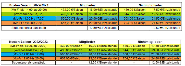 Die Buchung erfolgt online unter dem eigenen Account. Nach dem Einloggen werden die jeweiligen Hallenpreise angezeigt.